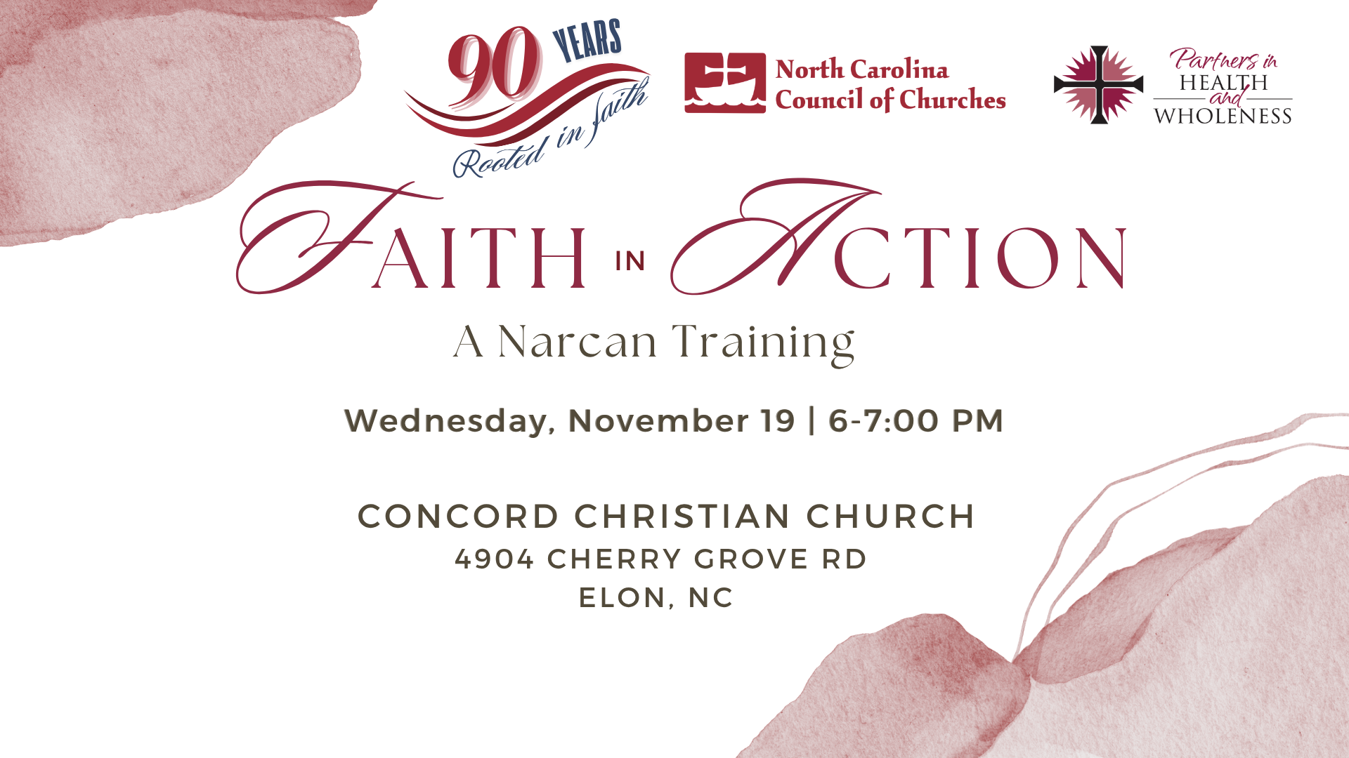 November 19 @ 6:00 pm - 7:00 pm Faith in Action-A Narcan Training-Concord Christian Church Concord Christian Church 4904 Cherry Grove Rd, Elon, NC