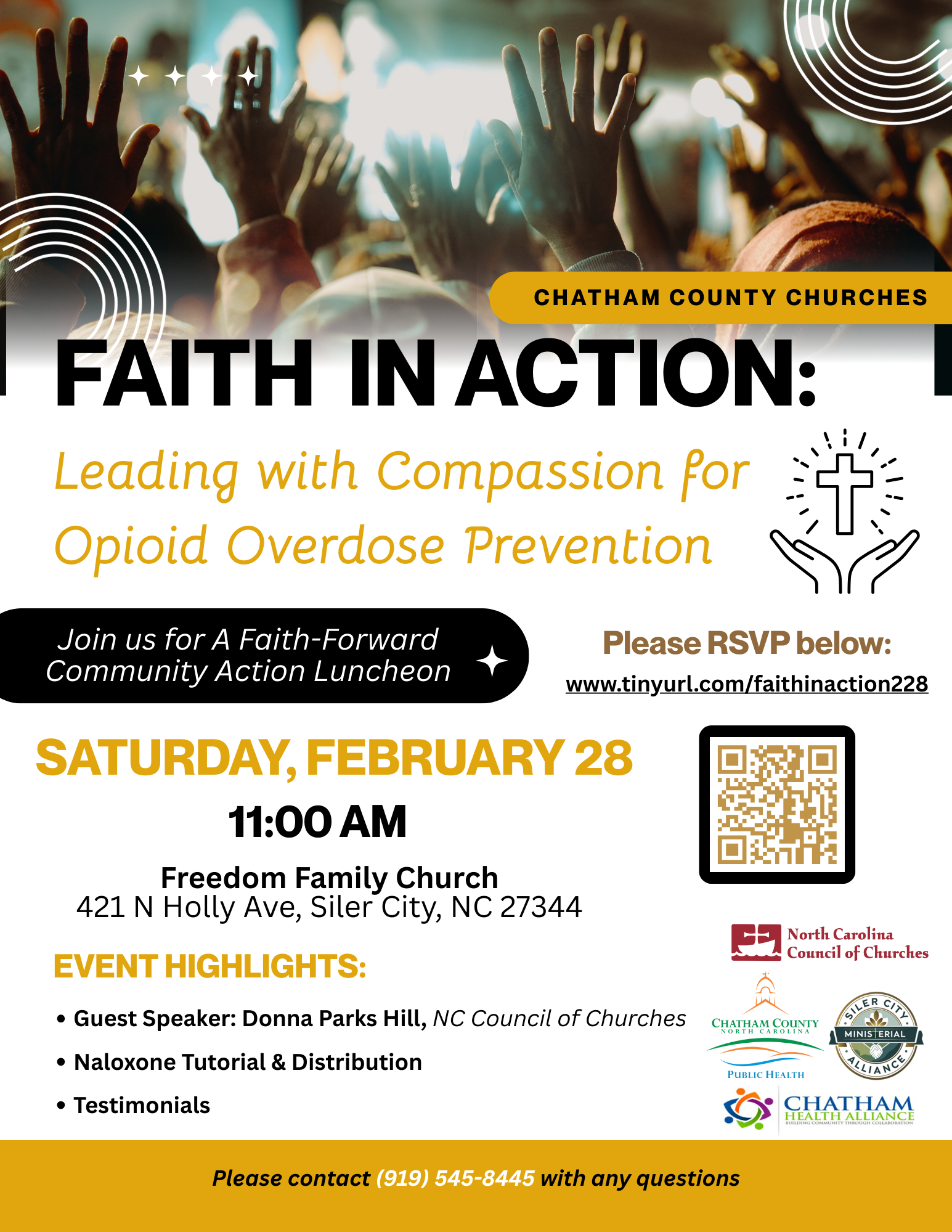 Freedom Family Church 421 N Holly Ave, Siler City, NC, United StatesJoin us for a faith-forward community luncheon focused on preventing opioid overdose in Chatham County. We’ll be joined by Donna Parks Hill, Associate Director of the Council’s Partners in Health […]