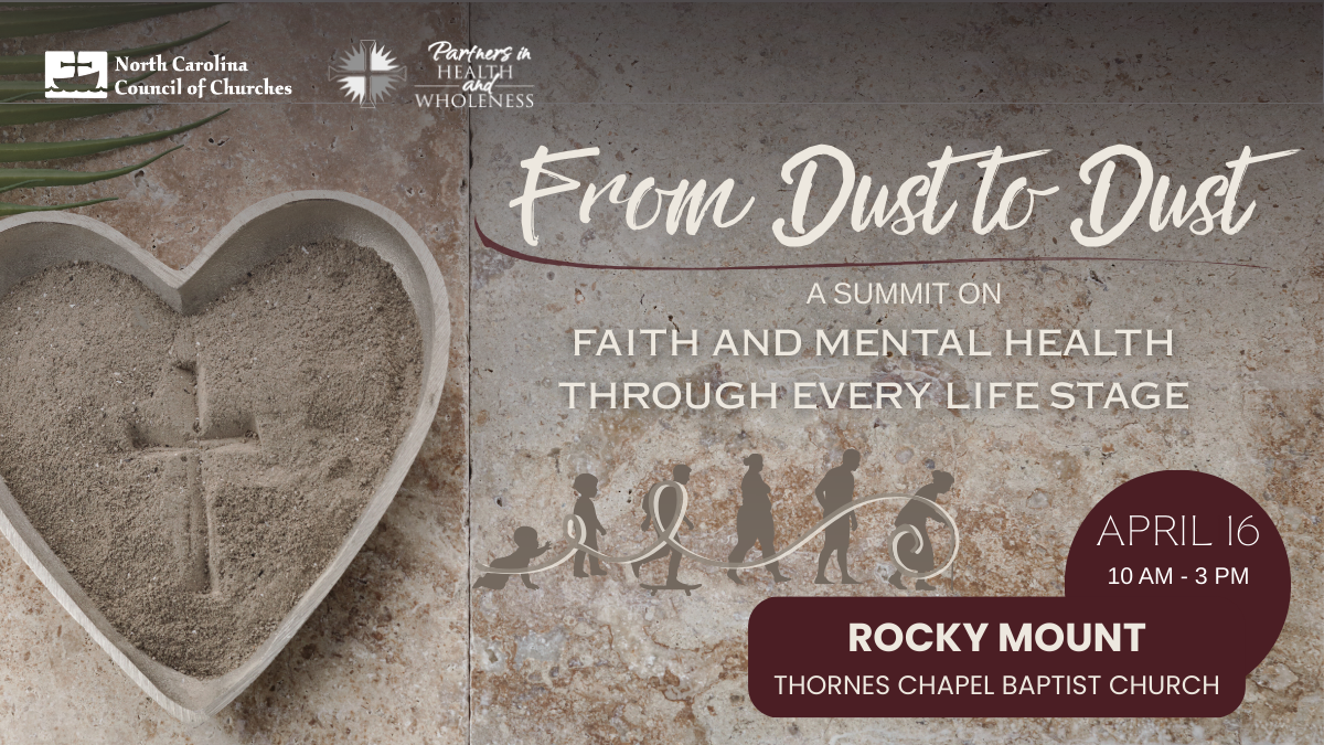 Join us for From Dust to Dust, Faith and Mental Health through Every Life Stage in Rocky Mount. Grounded in the reminder that we are formed from dust and return to dust, this one-day gathering invites people of faith to engage mental health as a sacred concern across the entire human lifespan. Through practical, trauma-informed workshops, participants will gain tools and knowledge addressing topics such as youth mental health, loneliness, grief and tragic loss, dementia and aging, menopause and emotional health, harm reduction, and the healing power of creativity and the arts.